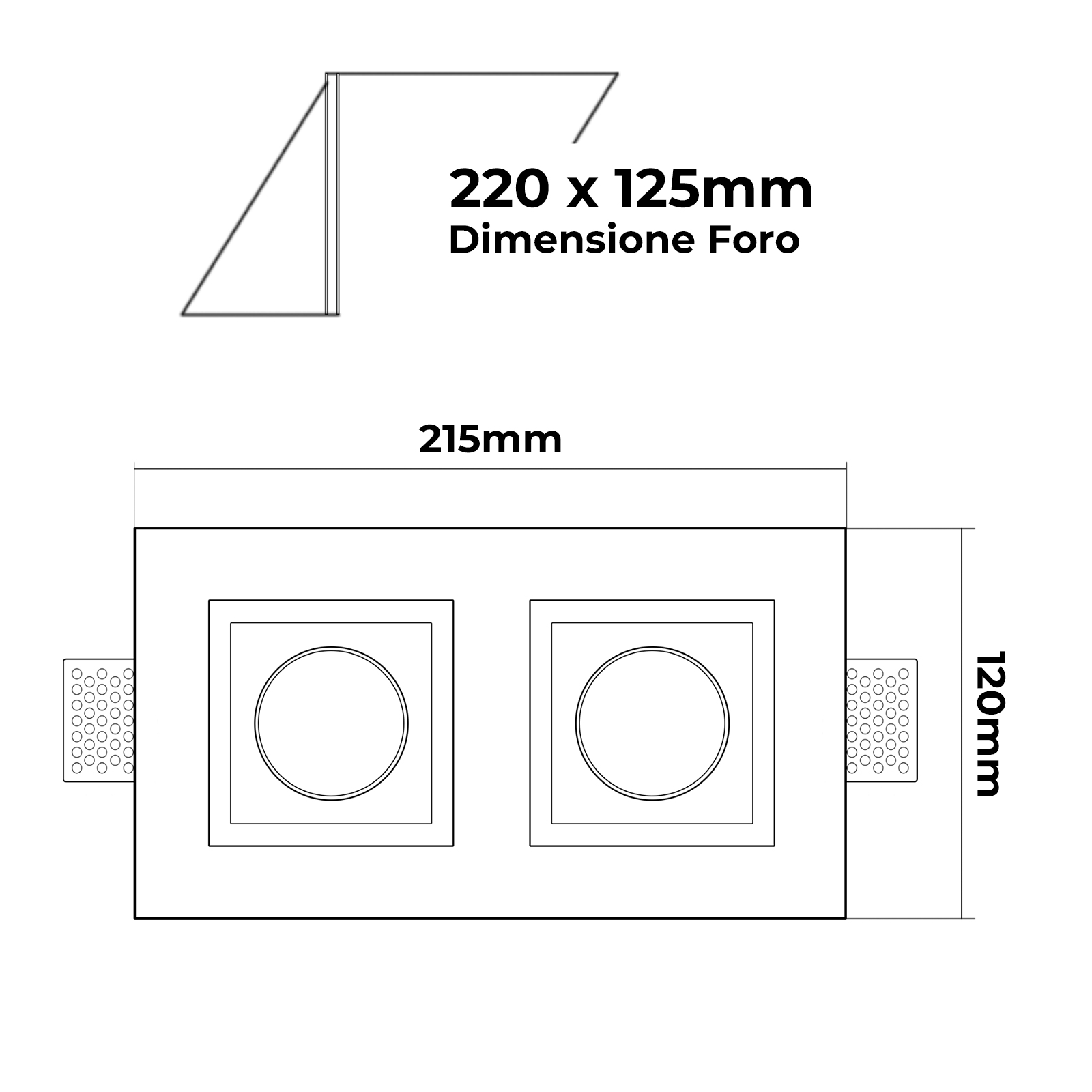 Infografica Dimensioni 215x120mm Portafaretto Rettangolare in Gesso con Doppio Attacco GU10