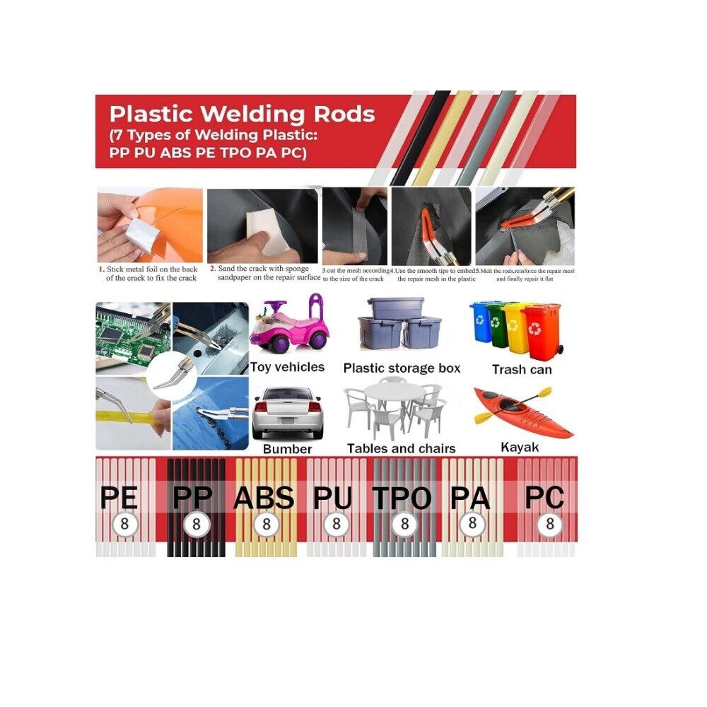 La nostra saldatore aria calda è adatta per riparare e rinforzare parti in plastica di tutte le automobili, come paraurti, cruscotti, portalampade, anelli di plastica e forniture quotidiane di plastica. Risparmia molto denaro!