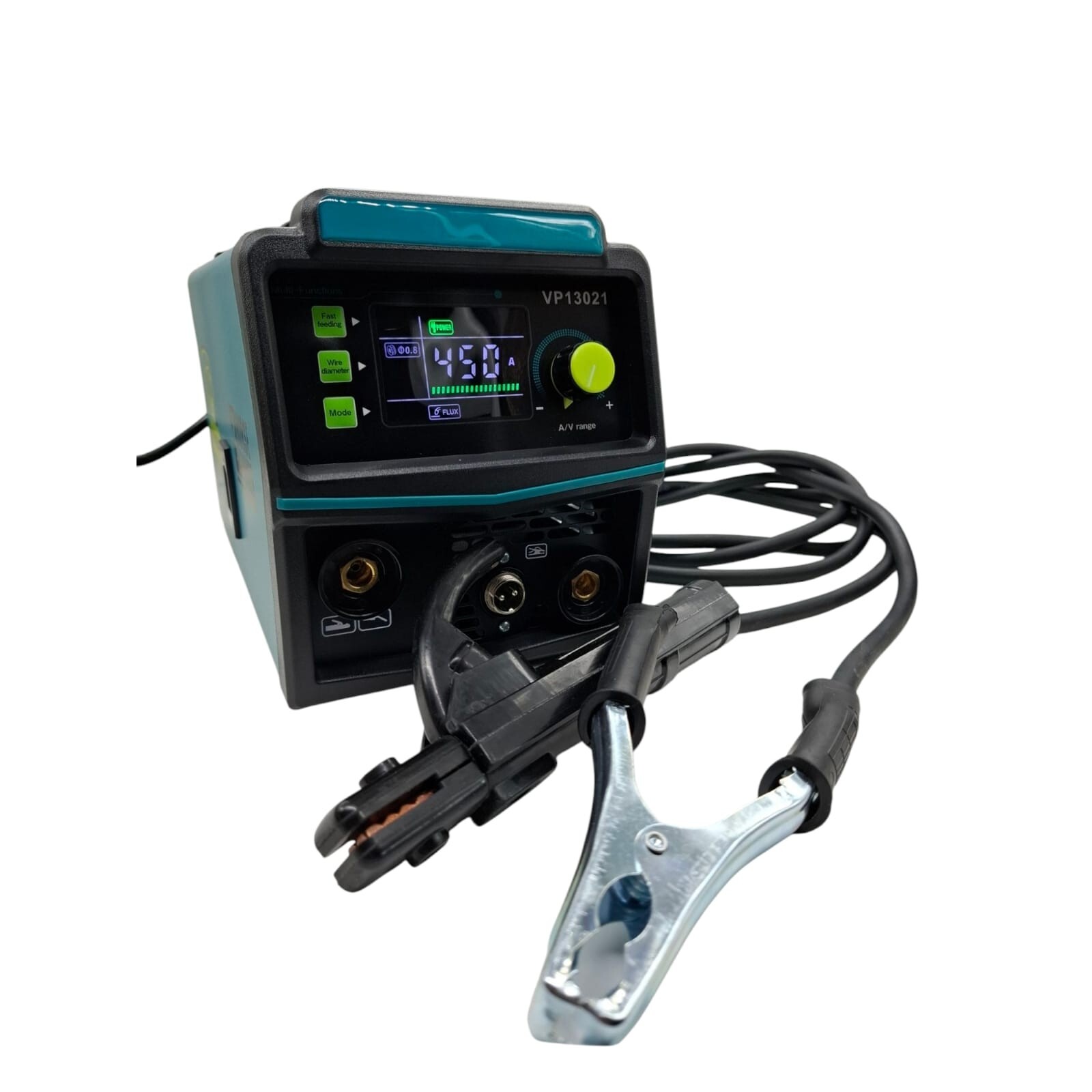 Saldatrice multifunzione inverter ad alte prestazioni, progettata per operazioni di saldatura in modalità MIG (senza gas, con filo animato) e MMA (a elettrodo rivestito).