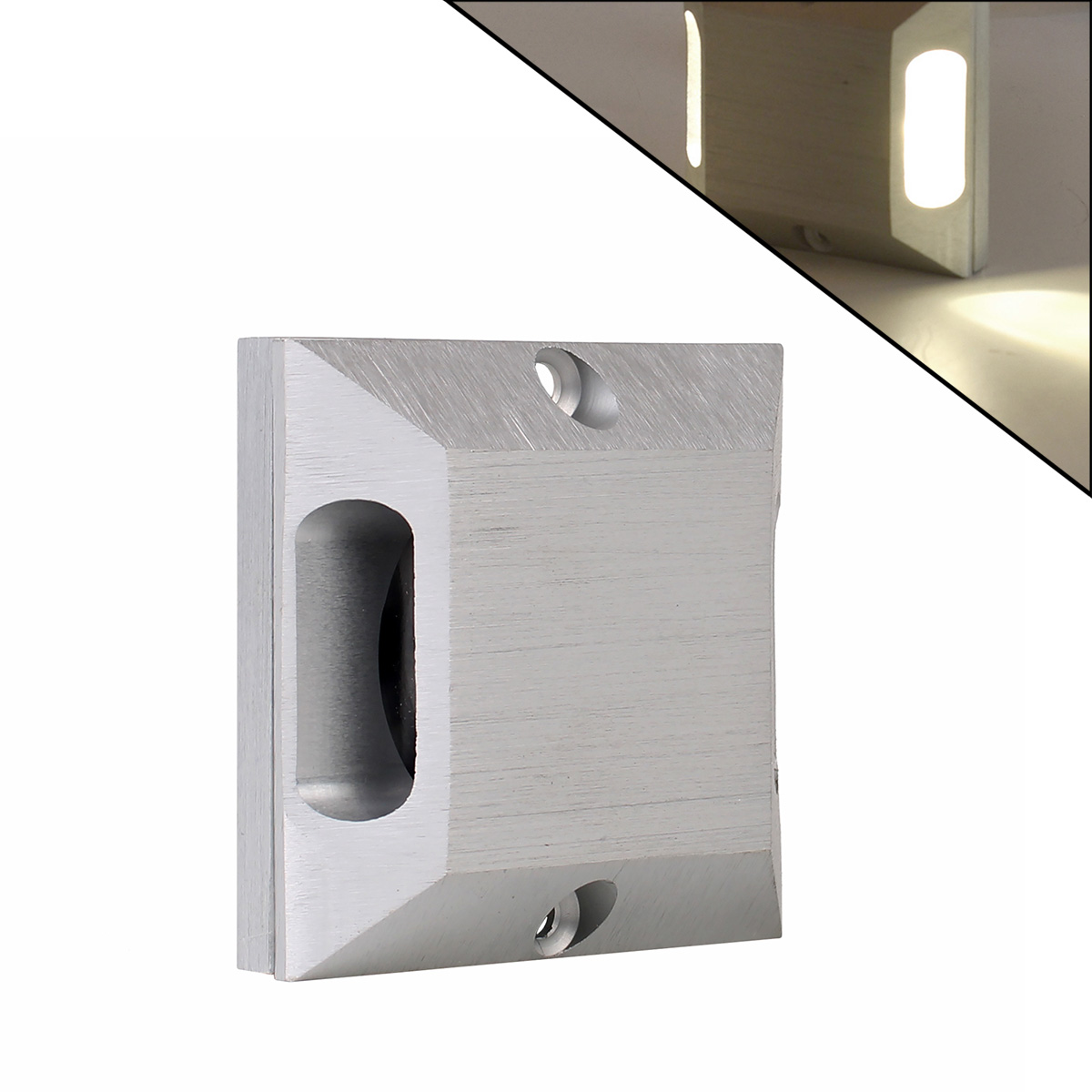 Il corpo del segnapasso è realizzato in alluminio spazzolato di alta qualità con finitura argento, che dona un aspetto contemporaneo ed elegante, perfetto per contesti residenziali e commerciali. La forma quadrata con dimensioni compatte (6 x 6 x 2 cm) ne consente l'integrazione discreta in qualsiasi superficie piana. Il design squadrato è pensato per armonizzarsi con ambienti minimalisti o architetture moderne.