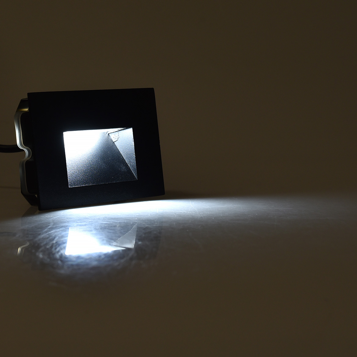 Realizzato in alluminio nero, il segnapasso LED 5W assicura ottima dissipazione del calore, prolungando la vita utile del LED. La sua forma rettangolare compatta (115 x 80 x 60 mm) lo rende discreto ma efficace, perfetto per installazioni in muretti, pareti, gradini e corridoi.