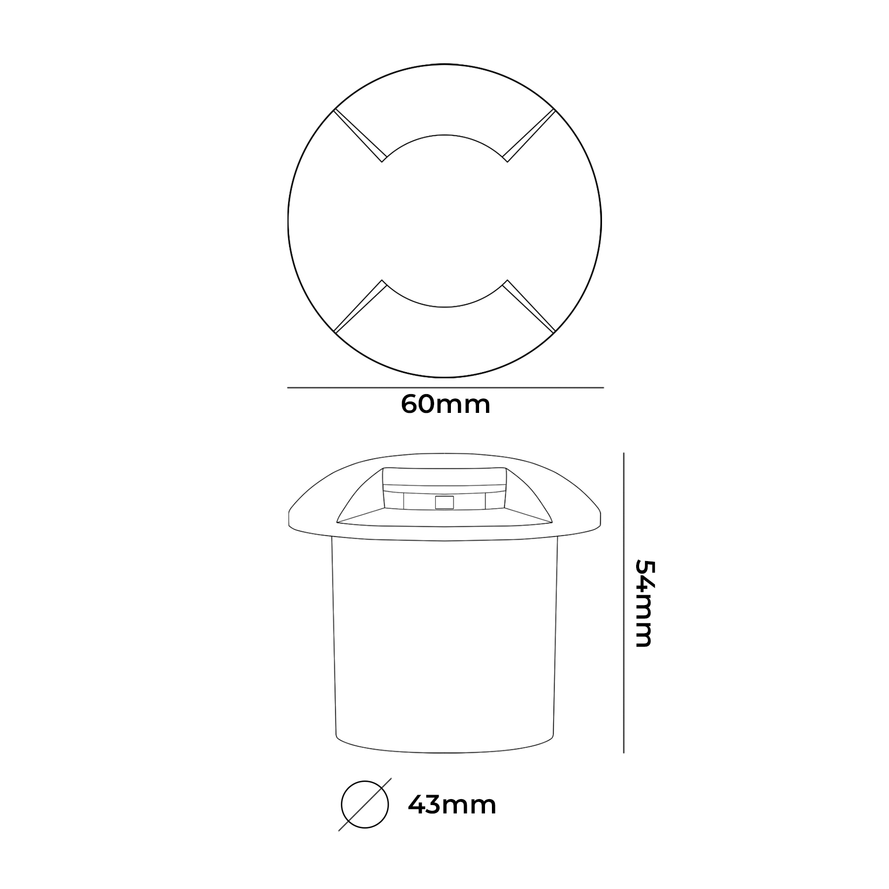 Infografica Faretto LED Segnapasso con Dimensioni 60x54mm e Foro di Incasso da 43mm