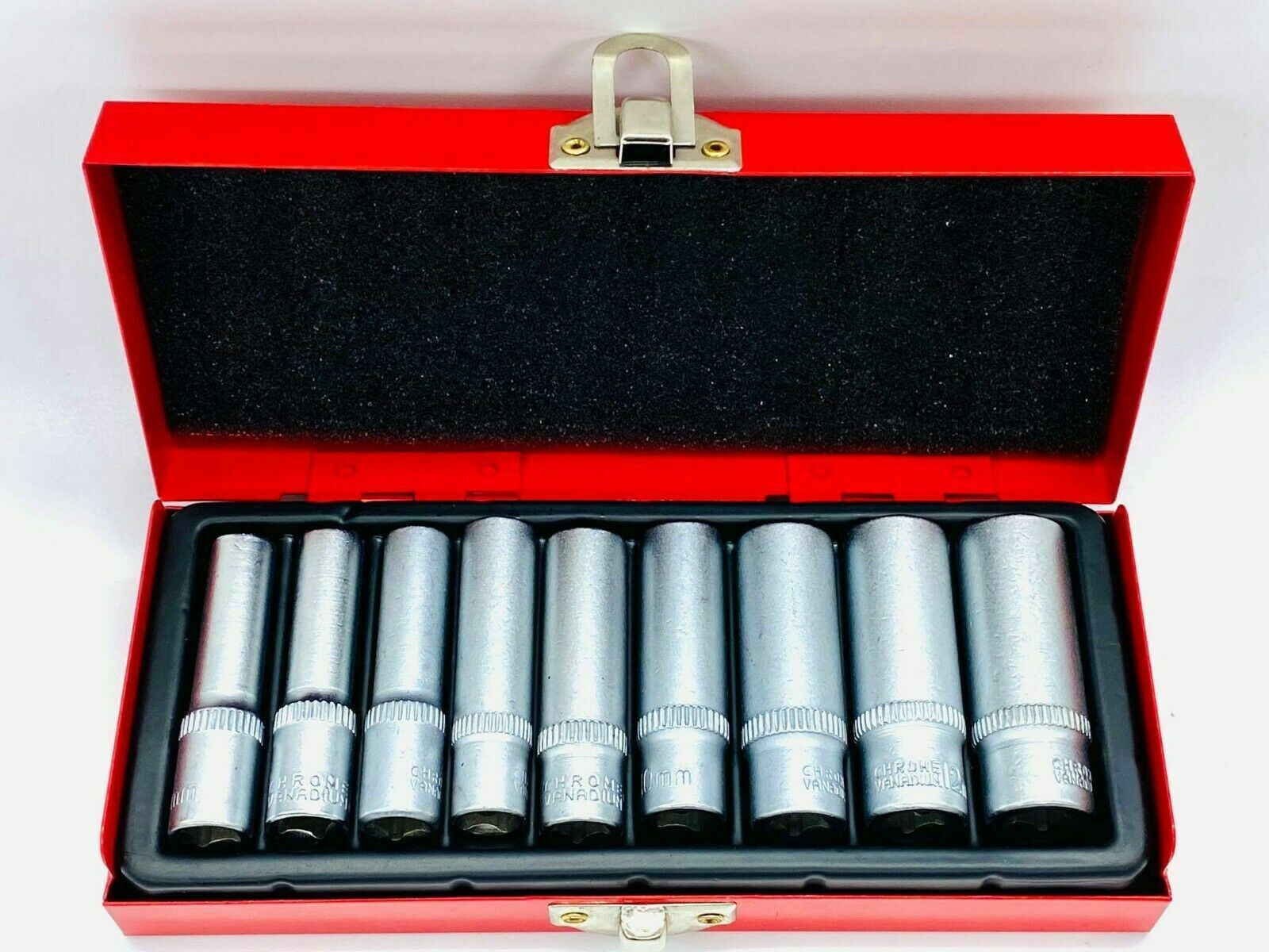 Set di chiavi a bussola lunghe 9 pezzi con attacco 1/4 al cromo vanadium misure da 5 a 13