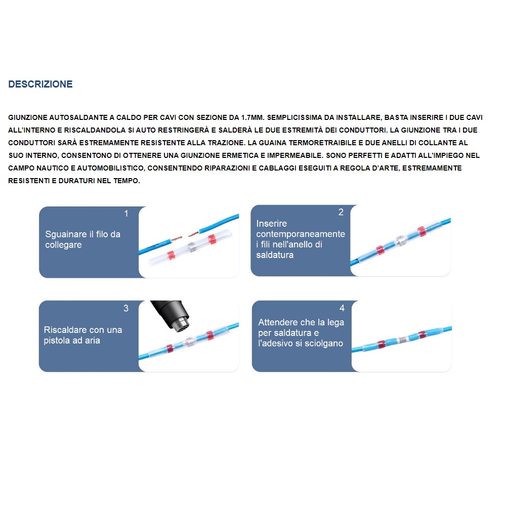 • Installazione Rapida e Semplice: Dimentica la necessità di saldare o crimpare! Basta riscaldare uniformemente il connettore con una pistola ad aria calda per ottenere una connessione stabile e sicura tra i cavi. Questo metodo non solo risparmia tempo, ma migliora anche l'efficienza lavorativa, ideale per spazi stretti o di difficile accesso.