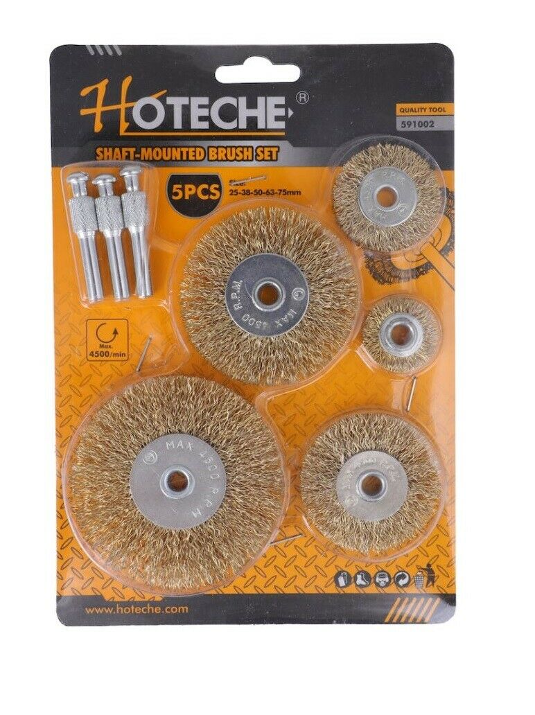 Set di 5 spazzole circolari adatte per l'uso con trapani elettrici. Ad alta resistenza, utili contro la ruggine e per la rimozione della vernice, disincrostazione, la sbavatura e la preparazione di cordoni di saldatura.