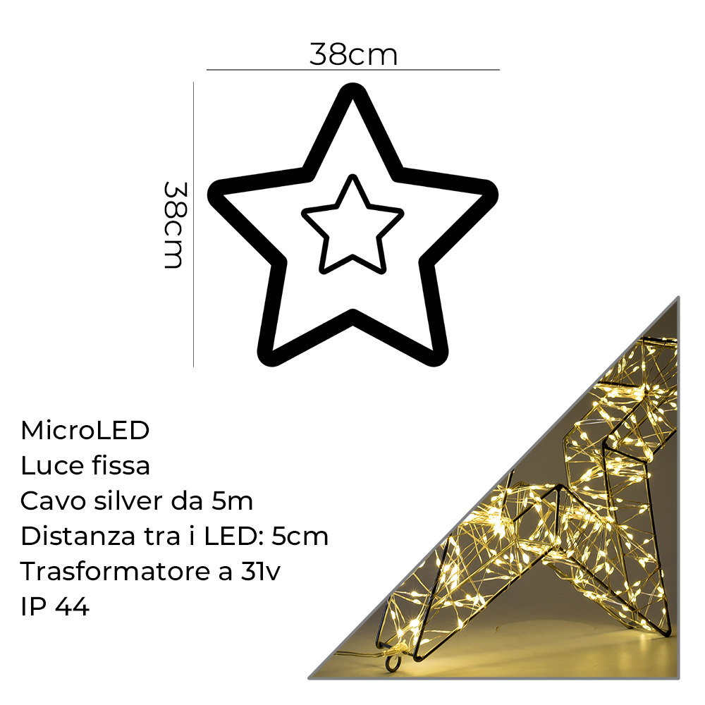 Questa elegante stella luminosa in alluminio è dotata di 600 MicroLED a luce calda fissa, ideale per decorazioni natalizie e illuminazioni suggestive di interni ed esterni. Con una dimensione di 38 x 38 cm, la sua struttura robusta garantisce una lunga durata e una presenza decorativa d'impatto. Il cavo silver da 5 metri è sapientemente avvolto attorno alla struttura di alluminio, creando un effetto visivo sofisticato e luminoso. La distanza di 5 cm tra i LED permette una distribuzione uniforme della luce, generando un'atmosfera calda e accogliente. Alimentata a bassa tensione di 31V, questa stella luminosa garantisce sicurezza e bassi consumi energetici, rendendola ideale per un uso prolungato. Con un grado di protezione IP44, è resistente agli agenti atmosferici e quindi perfetta per essere utilizzata anche all'esterno durante il periodo natalizio. Questa decorazione luminosa aggiungerà un tocco di eleganza e magia a balconi, finestre, giardini e a qualsiasi spazio che richieda un'illuminazione raffinata e festosa