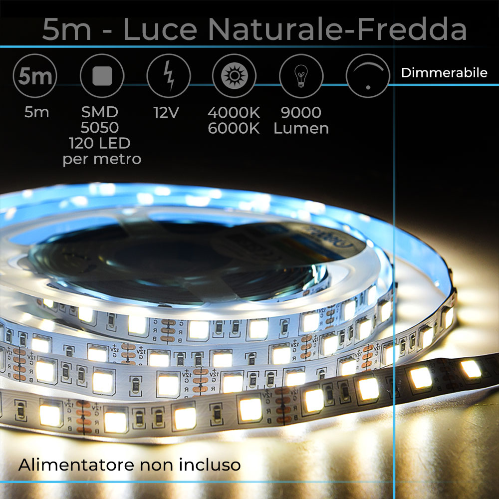 Infografica Striscia LED da 12V da 5 Metri con Luce Naturale o Fredda IP20 per Uso Interno