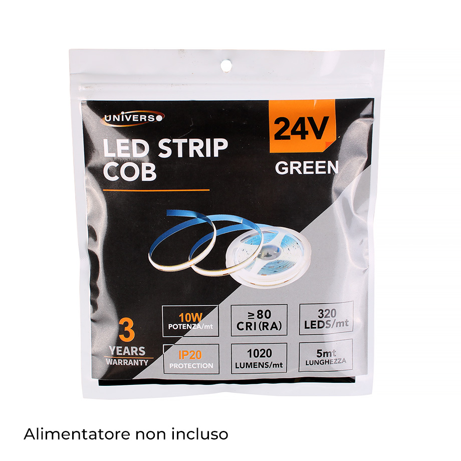 La striscia LED COB verde da 5 metri a 24V rappresenta una soluzione di illuminazione innovativa e versatile, ideale per chi desidera creare ambienti suggestivi e personalizzati. Questa striscia LED si distingue per la sua luminosità eccezionale, la flessibilità e la facilità d'installazione, rendendola perfetta per una vasta gamma di applicazioni, sia decorative che funzionali. Con una potenza di 10 watt per metro, la striscia LED COB offre una luce intensa e uniforme, capace di valorizzare qualsiasi spazio. Il colore verde della luce è particolarmente indicato per creare atmosfere accoglienti e rilassanti, ideali per feste, eventi, o semplicemente per aggiungere un tocco di originalità alla tua casa. Grazie alla tecnologia COB (Chip on Board), la luce è distribuita in modo omogeneo lungo tutta la striscia, senza punti di luce visibili, garantendo un effetto estetico elegante e professionale. La striscia LED COB misura 5 metri in lunghezza e ha uno spessore di soli 8mm, il che la rende estremamente flessibile e facile da installare anche in spazi ristretti. È dotata di 320 LED per metro, offrendo una luminosità di 1020 lumen per metro. Con un indice di resa cromatica (CRI) superiore a 80, questa striscia LED assicura colori vividi e naturali, fondamentali per creare ambienti visivamente piacevoli. L'angolo di illuminazione di 180° permette di coprire un'ampia area, rendendo questa striscia LED adatta a molteplici utilizzi, come l'illuminazione di interni, decorazioni per feste ed eventi, illuminazione di scaffali, vetrine e mobili. La striscia può essere tagliata ogni 5 cm, permettendoti di personalizzare la lunghezza in base alle tue esigenze specifiche. Un altro vantaggio di questa striscia LED COB verde è la sua lunga durata, con una vita media di 30.000 ore. Questo significa che non dovrai preoccuparti di sostituzioni frequenti, risparmiando tempo e denaro nel lungo periodo. Il grado di protezione IP20 la rende adatta per uso interno, proteggendola da polvere e piccoli corpi solidi. L'alimentazione a 24V DC assicura un funzionamento sicuro e stabile, compatibile con la maggior parte degli alimentatori per strisce LED disponibili sul mercato. Tuttavia, è importante notare che l'alimentatore non è incluso, quindi dovrai procurartene uno separatamente. L'installazione della striscia LED COB verde è semplice e veloce. Il retro della striscia è adesivo, permettendo di fissarla saldamente a superfici lisce e pulite. Questo ti consente di posizionarla facilmente su pareti, soffitti, mobili e molto altro. La possibilità di tagliare la striscia ogni 5 cm ti permette di adattarla perfettamente a qualsiasi spazio, garantendo un'illuminazione precisa e personalizzata