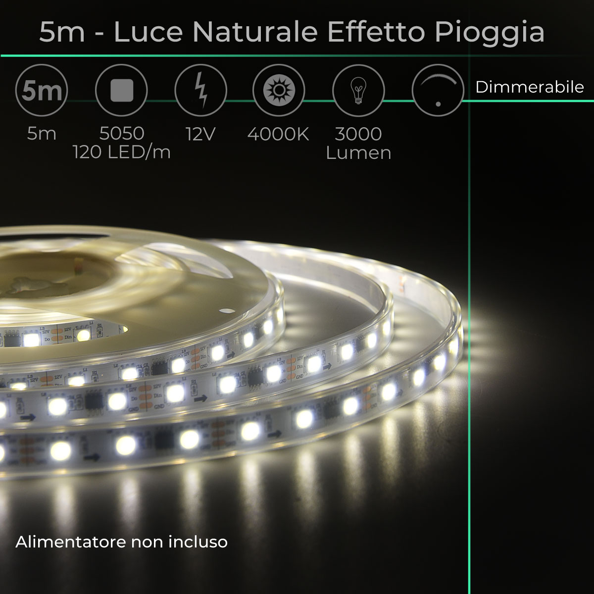 Infografica Striscia LED Bifunzionale Luce Naturale 4000K ed Effetto Pioggia