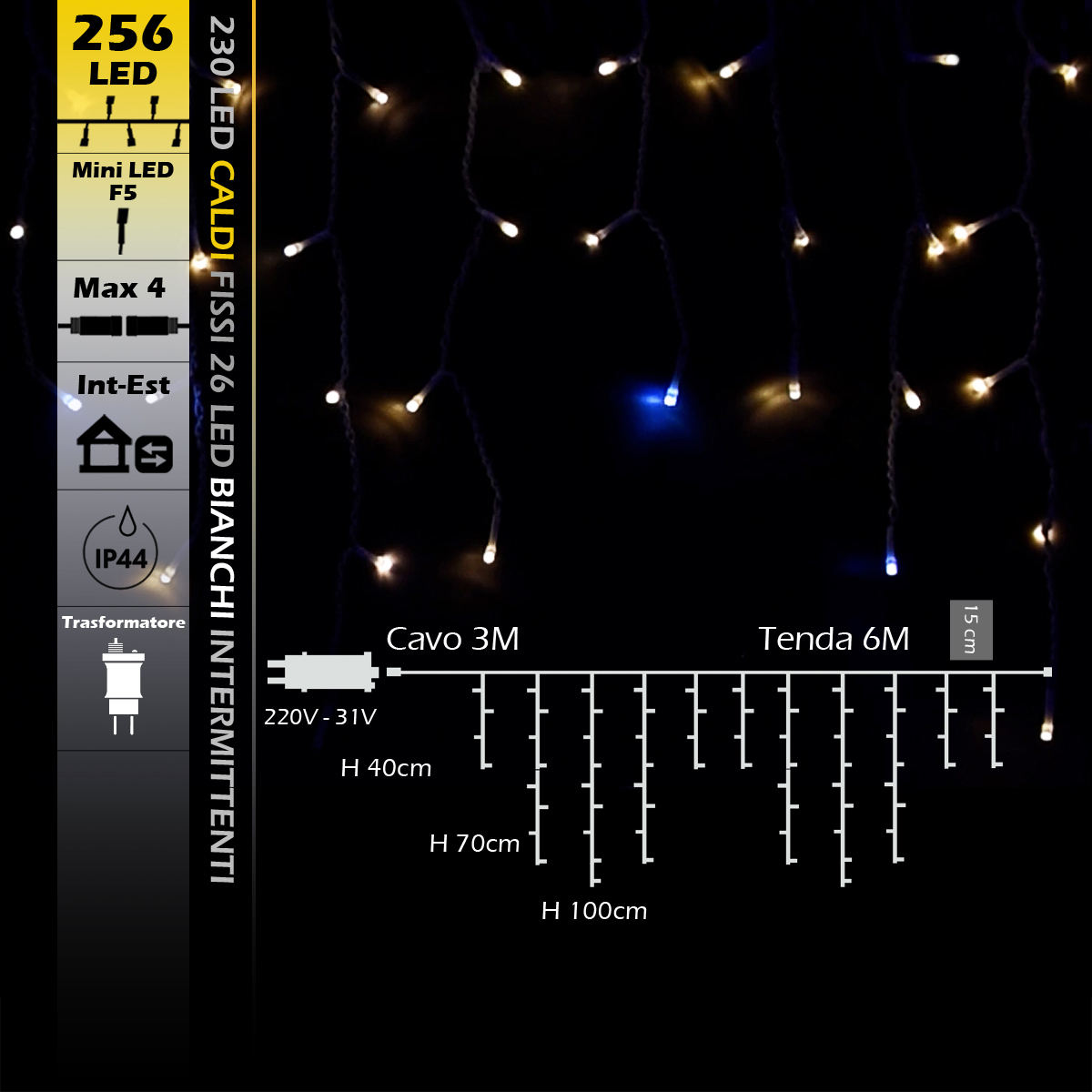 Illumina i tuoi spazi con la Tenda Luminosa LED da 6 metri dotata di 256 LED, di cui 230 a luce calda fissa e 26 LED bianchi freddi intermittenti per un effetto flash elegante e dinamico. Questa combinazione unica crea un’atmosfera accogliente arricchita da scintille di luce fredda, perfetta per decorazioni festive e scenografiche.