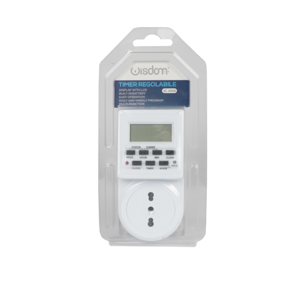 • Timer meccanico regolabile con display LCD che permette di programmare l'accensione all'orario desiderato lampade ed elettrodomestici