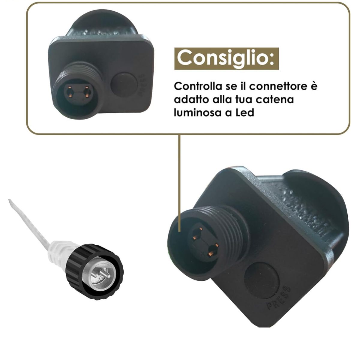Prima dell’acquisto è importante verificare la compatibilità, controllando tensione, corrente, wattaggio e la polarità (+/-) dei due fori del connettore. Si consiglia inoltre di osservare attentamente le foto del prodotto e confrontare l’attacco con quello delle proprie luci per evitare incompatibilità.