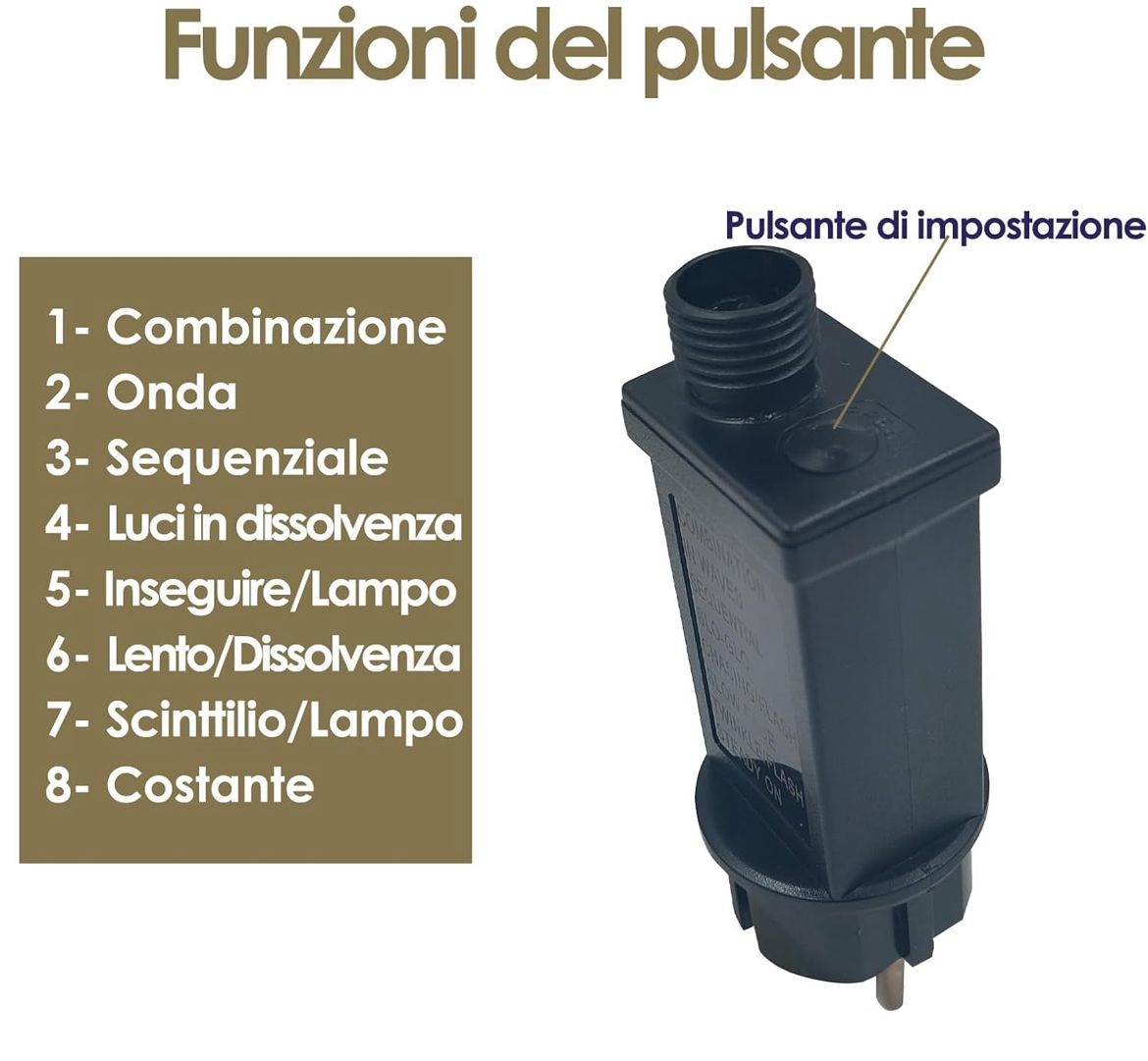 Dispone di 8 giochi di luce selezionabili tramite un pulsante posto sul retro e memorizzati nel chip interno. La funzione memoria permette di mantenere l’ultima modalità utilizzata anche dopo lo spegnimento, evitando di dover reimpostare l’effetto luminoso preferito a ogni riaccensione.