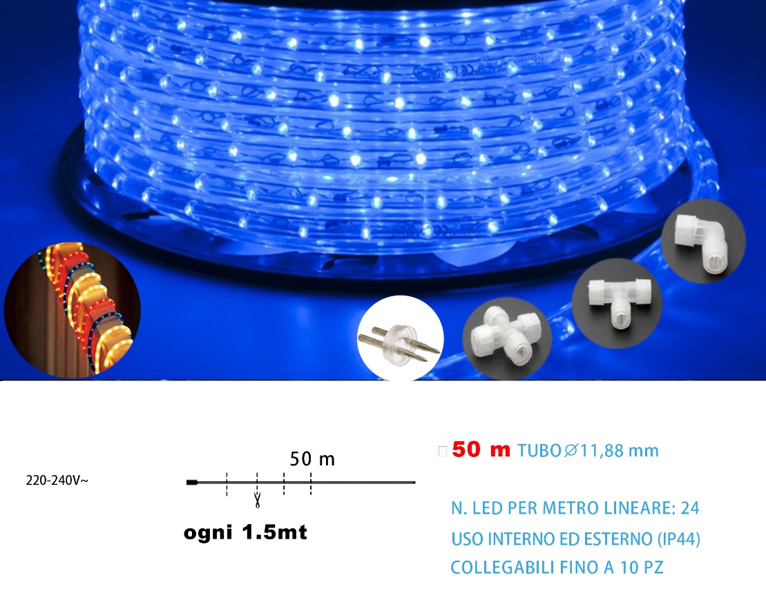 Tubo luminoso led 50mt tagliabile 24ledxmt con cavo in gomma 11.88mm luce calda